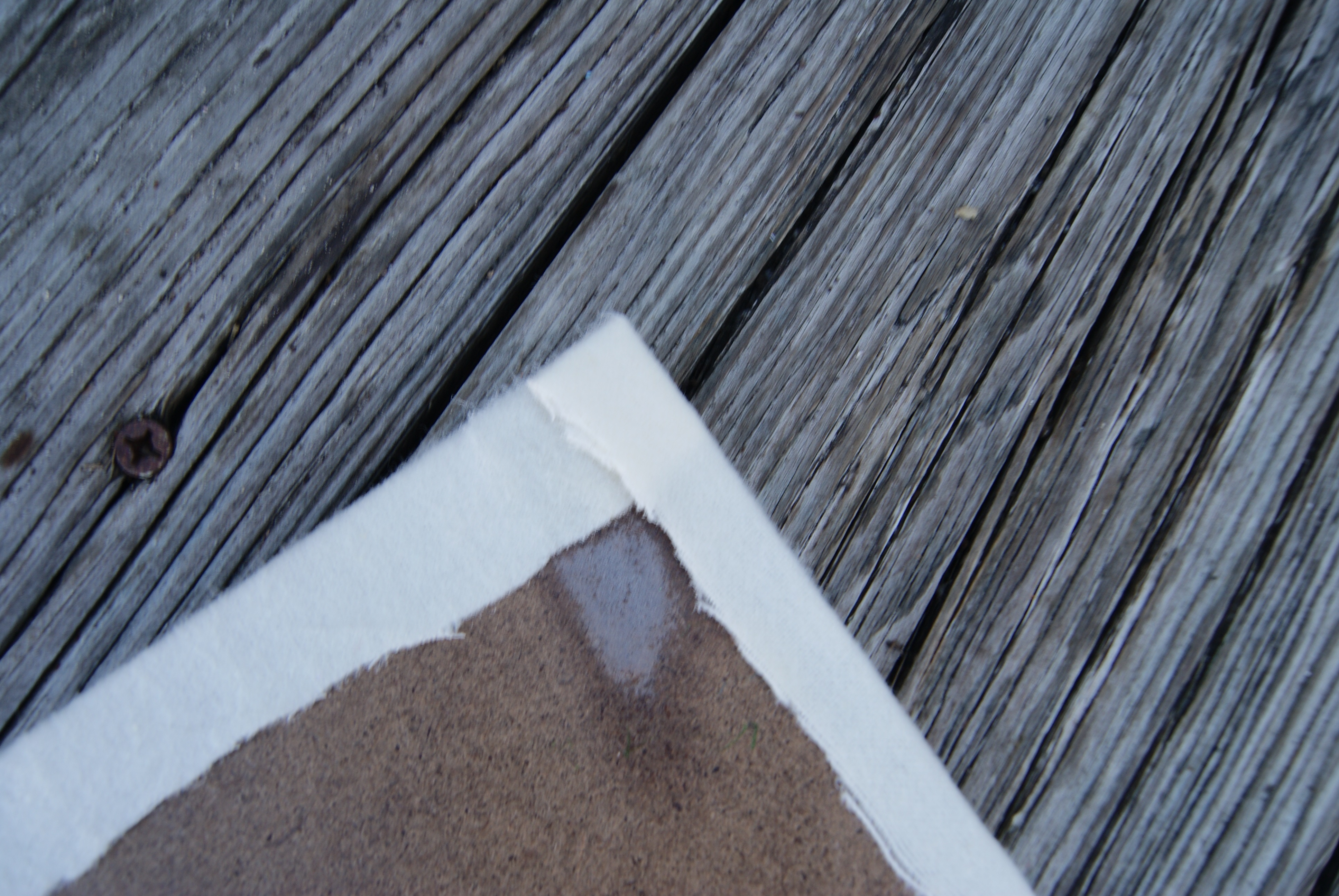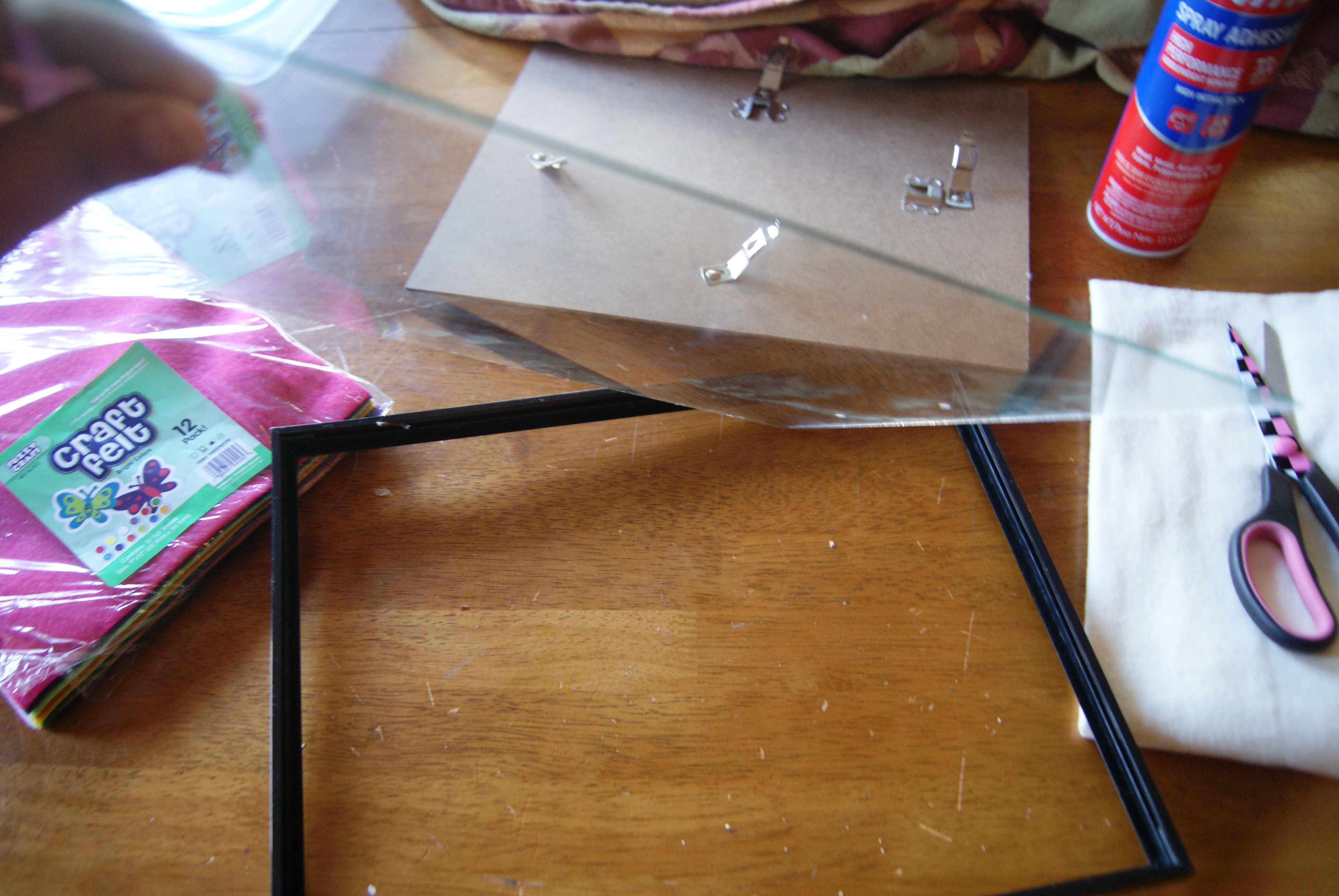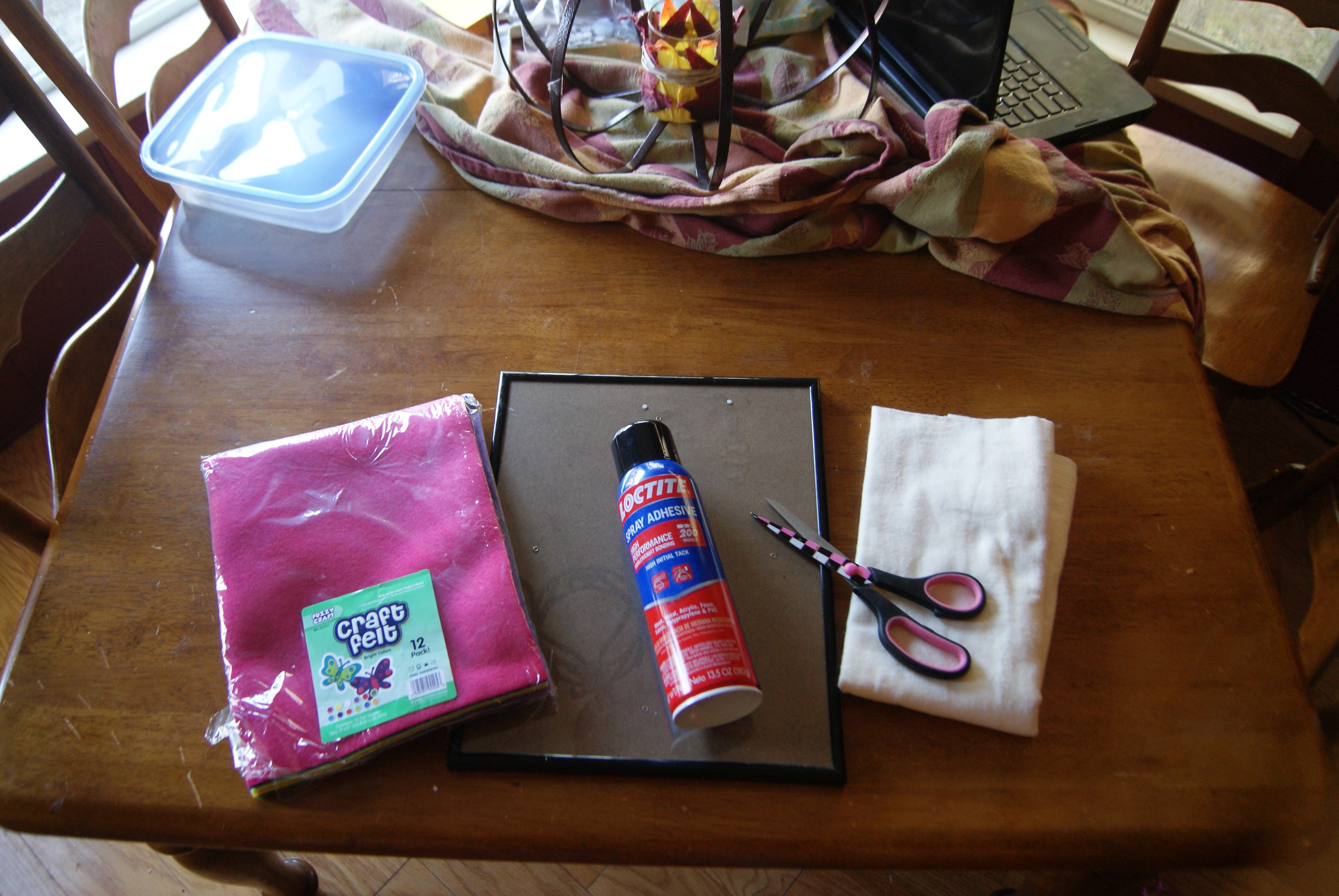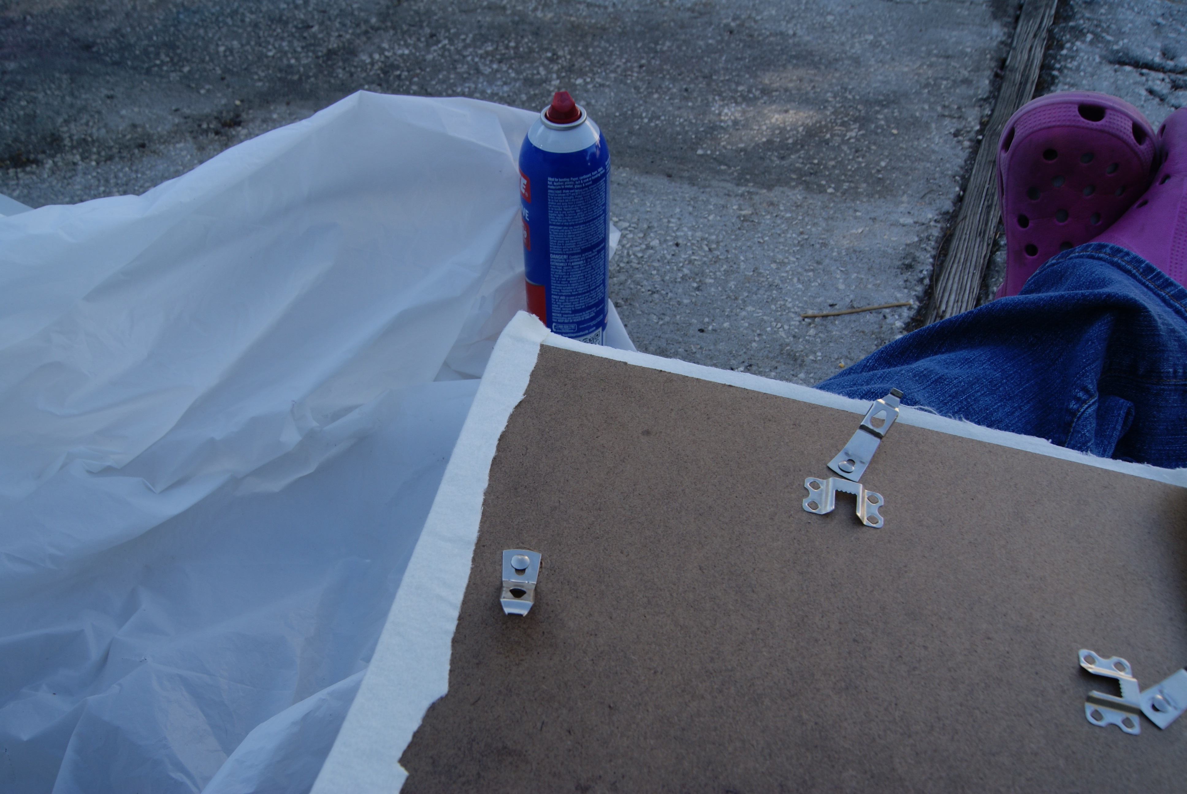 Take your felt and backboard outside for ventilation, lay one a drop cloth or newspapers. Spray the board (the side that faces inward on the frame) and the felt with adhesive. Working quickly, press the felt onto the board, attempting to center it as well as you can. The adhesive is fairly forgiving and if you misplace it you will have a couple chances to reposition and still maintain adhesion. Fold the edges to the back and press down, tuck your corners in, much like you would when wrapping a present. Spray a bit more adhesive on fabric if needed to tack in place. Allow to dry (It does not take long- maybe 15 minutes).
