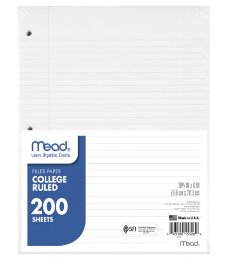 Mead Filler Paper, Loose Leaf, College Ruled, 200 Sheets/Pack $1.82 (Prime Pantry)