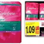 Carefree Pantiliners, 20 ct $1.09, sale price through 11/11 Use $0.50/1 Carefree Product, Limit one coupon per person, Limit of 4 like coupons per transaction from SS 10/28 (exp 12/31) Final Price: $0.59 or $0.09 with double