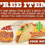 Join TacoTime Fresh Rewards™ and become a member of the freshest club in town! Keep an eye out for exclusive member-only updates and great deals delivered right to your inbox. As a thanks for signing up, buy one menu item and get a menu item of equal or lesser value FREE. Join today and receive Continue Reading …