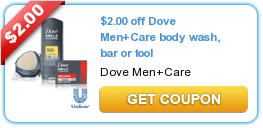 Use two $2.00/1 – Dove Men + Care Body Wash, 13.5 oz or larger; Body & Face Bar, 6 pk or larger; or Shower Tool, excludes trial/travel sizes, maximum of 2 identical coupons allowed in same shopping trip – (coupons.com)