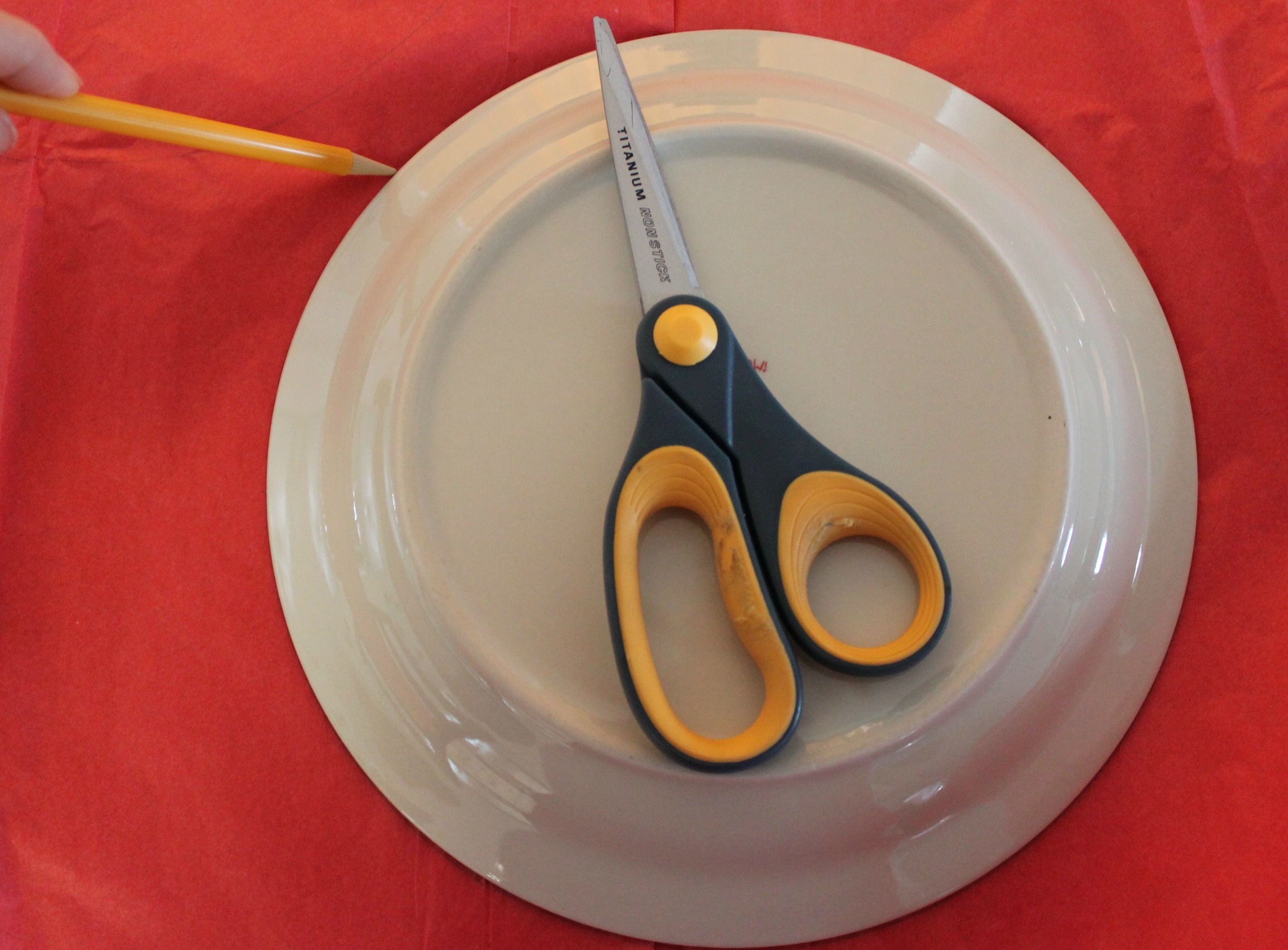 1. One circle of tissue paper (approximately 10 inches) makes one rose, so stack as many sheets as you will need. Place a dinner plate on the tissue paper and cut the paper to make circles. It may be easier if you draw a line with pencil around the plate and then cut.