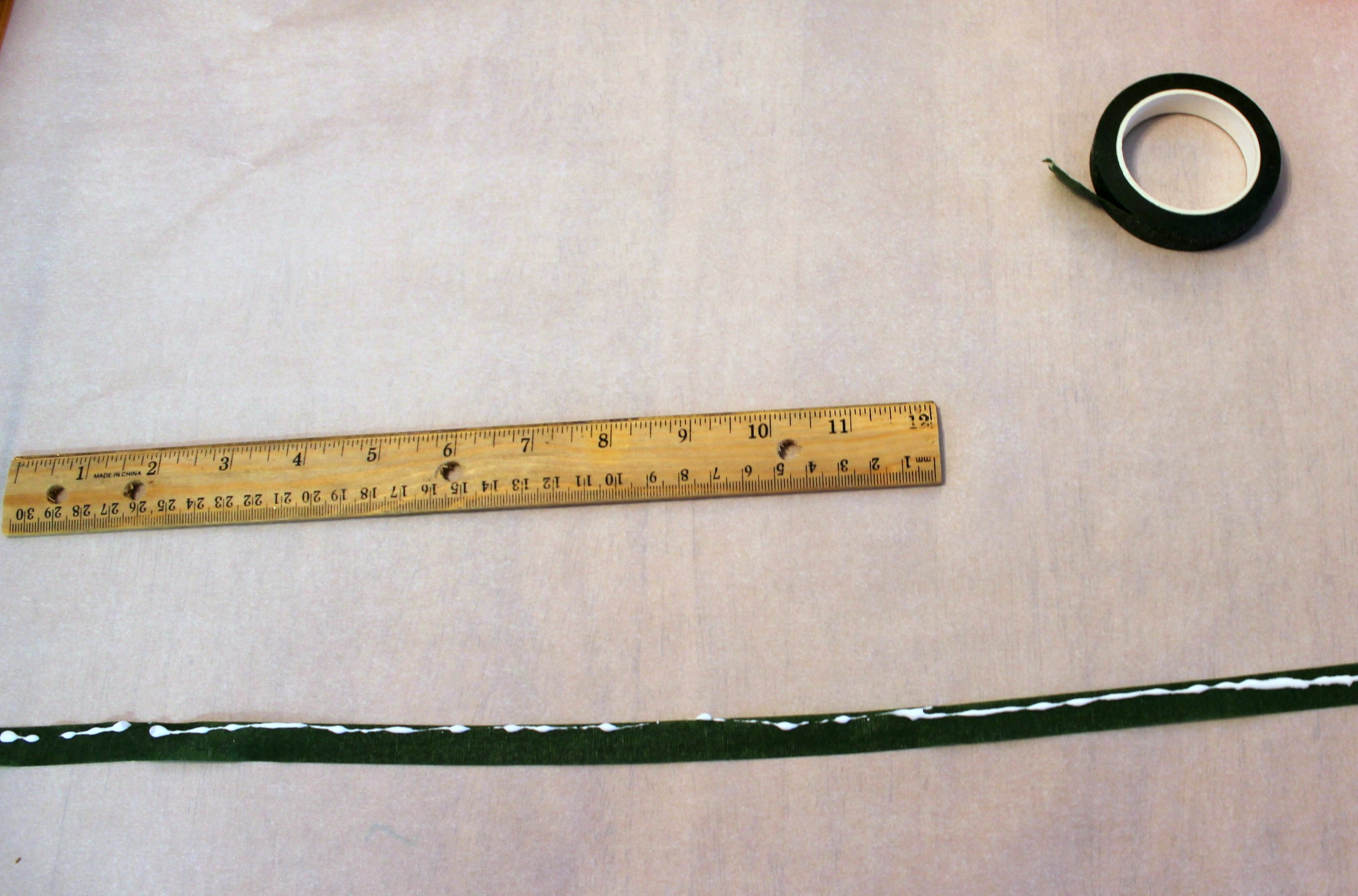 3. Measure a 24-inch piece of floral tape and lay it on a piece of parchment. With craft glue, make a thin line along the top, stopping at 18 inches.