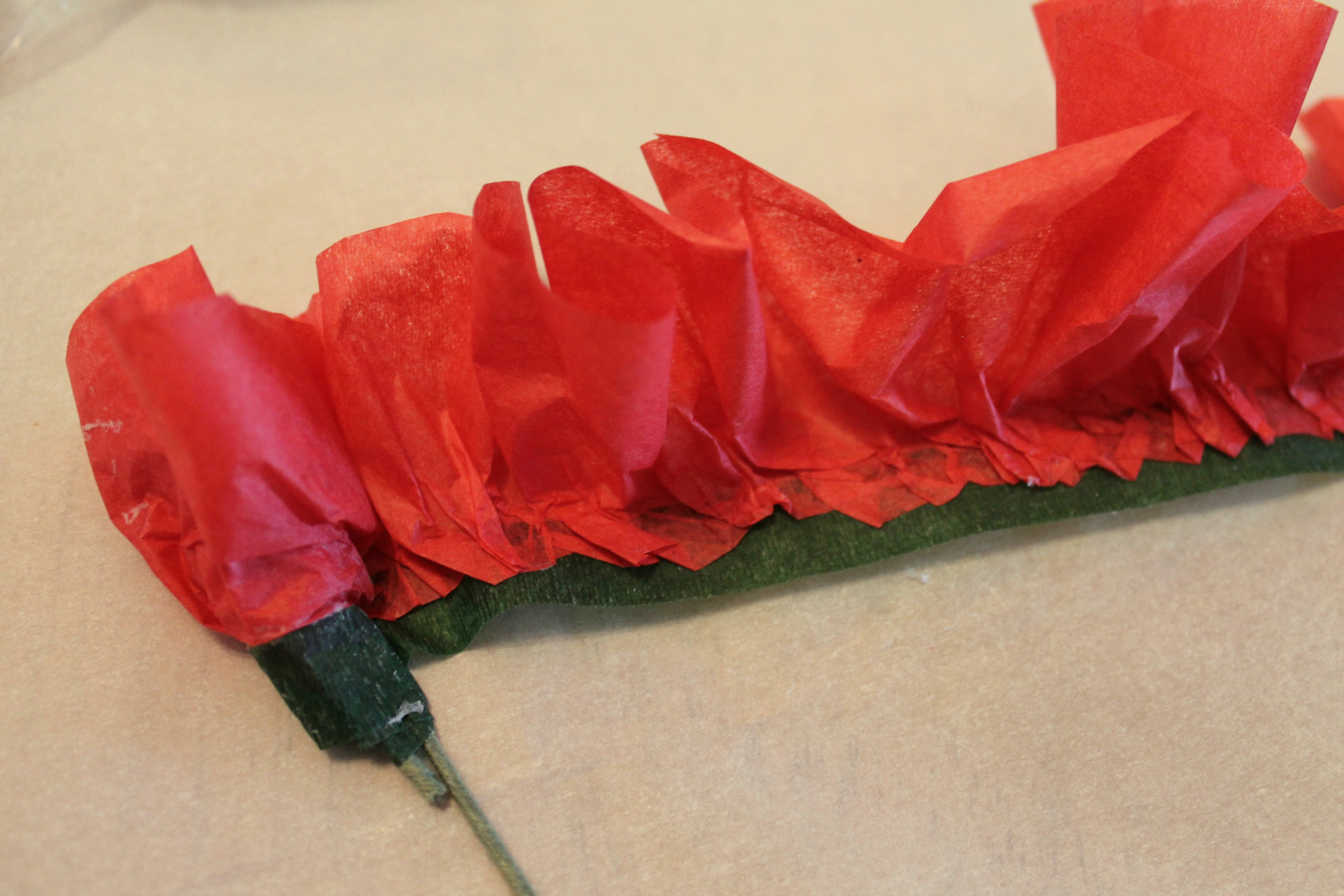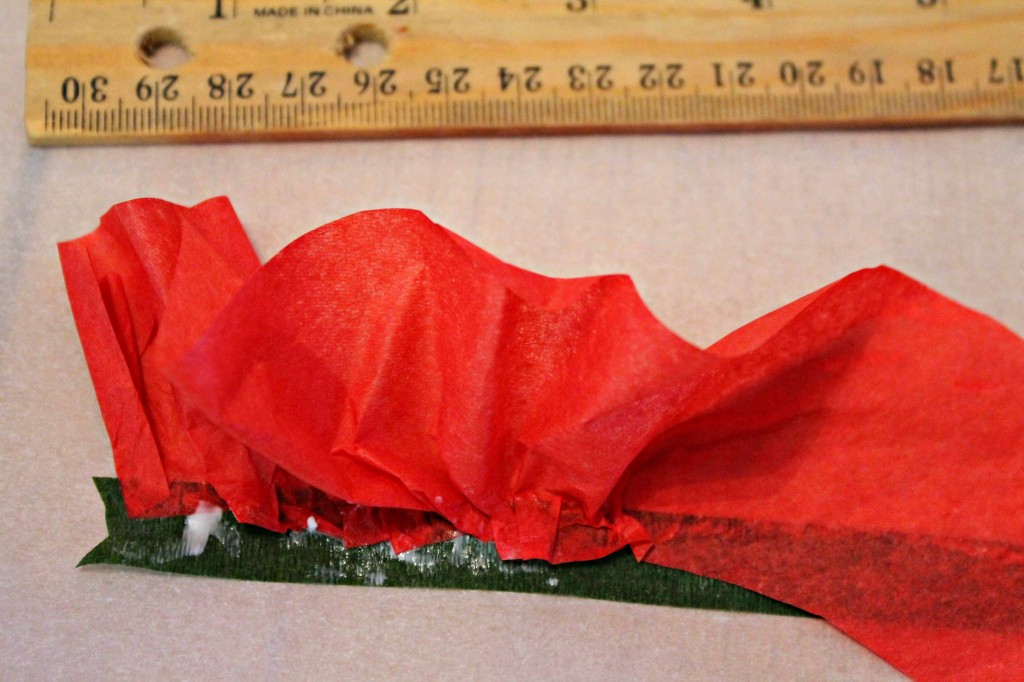 4. Beginning with the outer end of the tissue spiral, with the inside edge of the spiral facing you, begin gathering and pressing the tissue to the top half of the tape, along the glue line. This doesn’t have to be perfectly even; it will look better if it is a casual gather. You may run out of tissue paper before the glue stops. Don’t worry―as long as you have 12 inches of gathered tissue, the rose will be fine.
