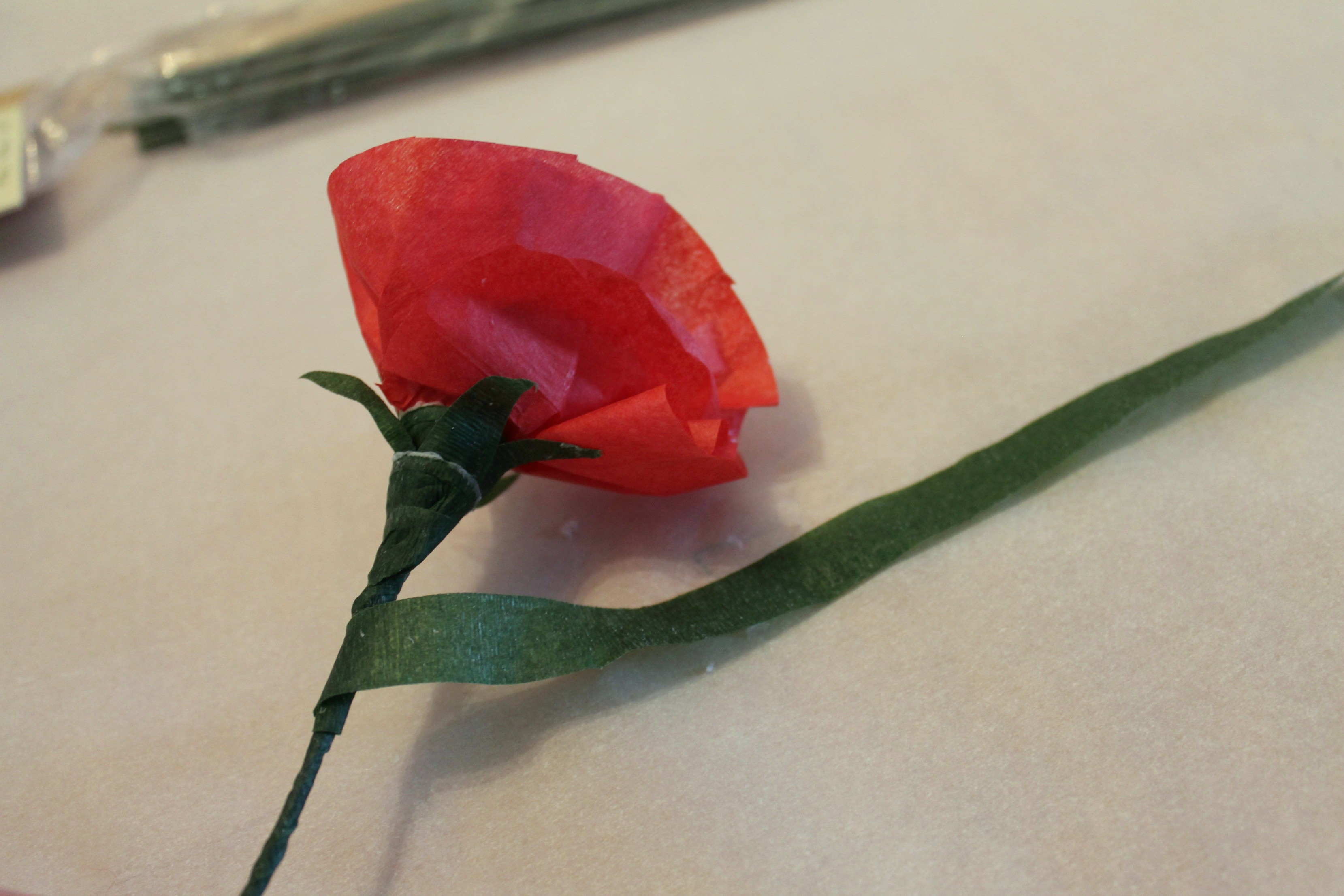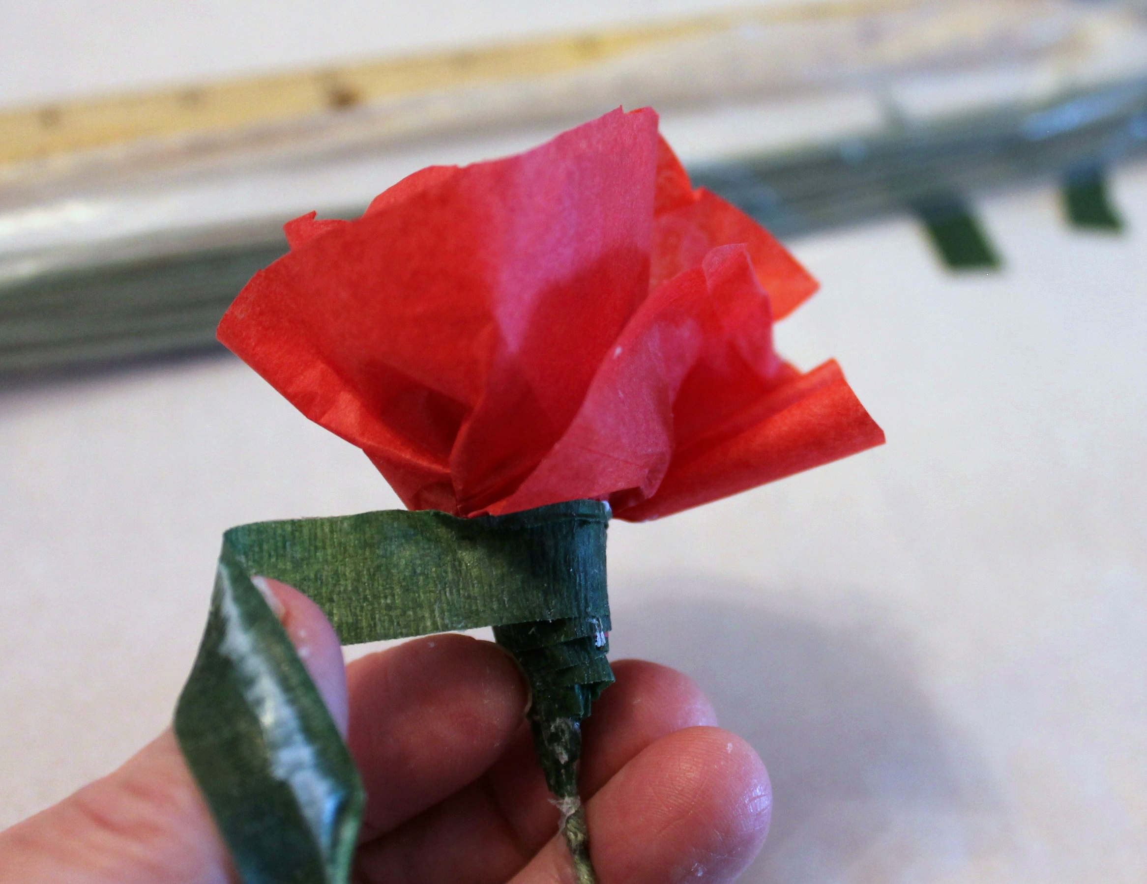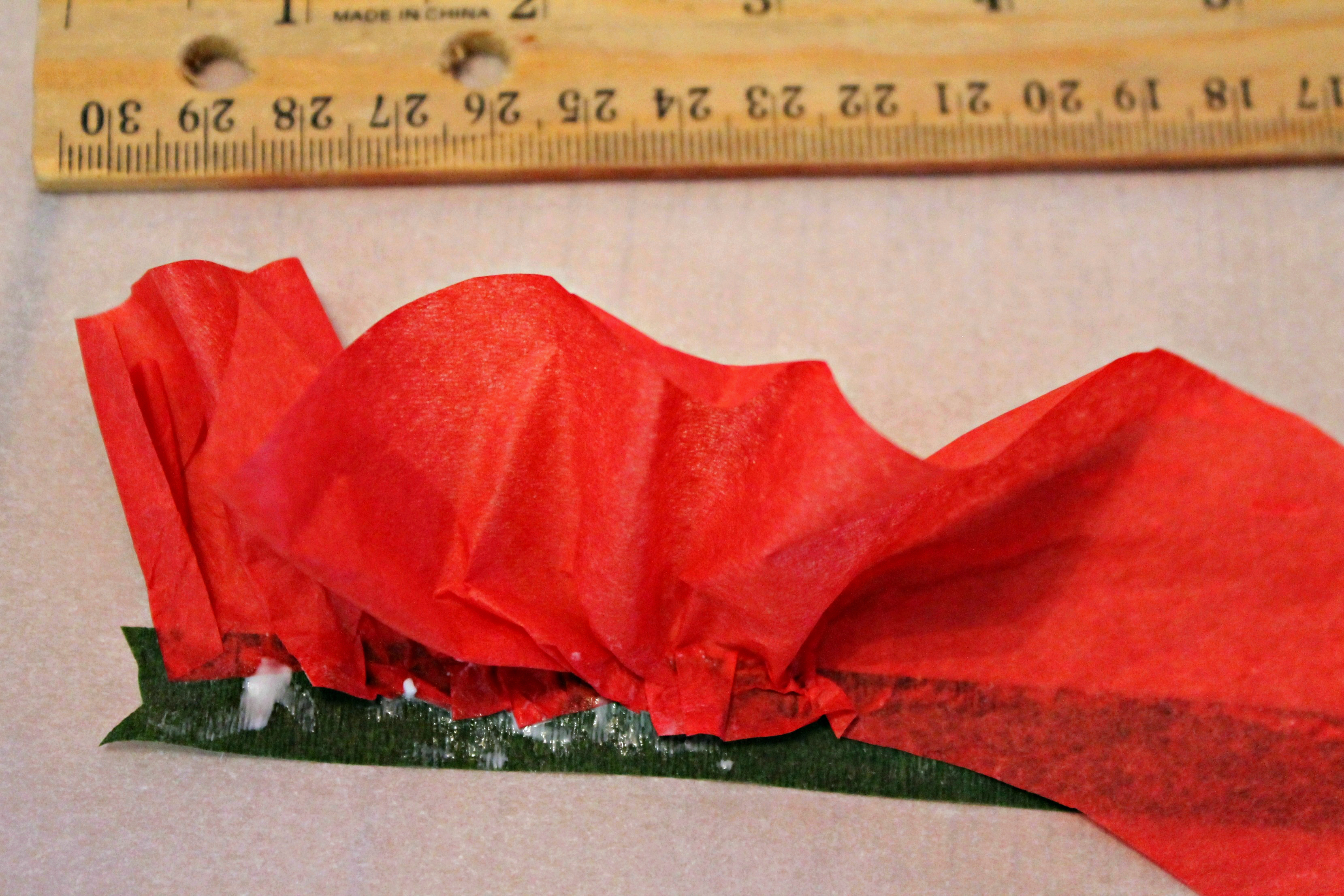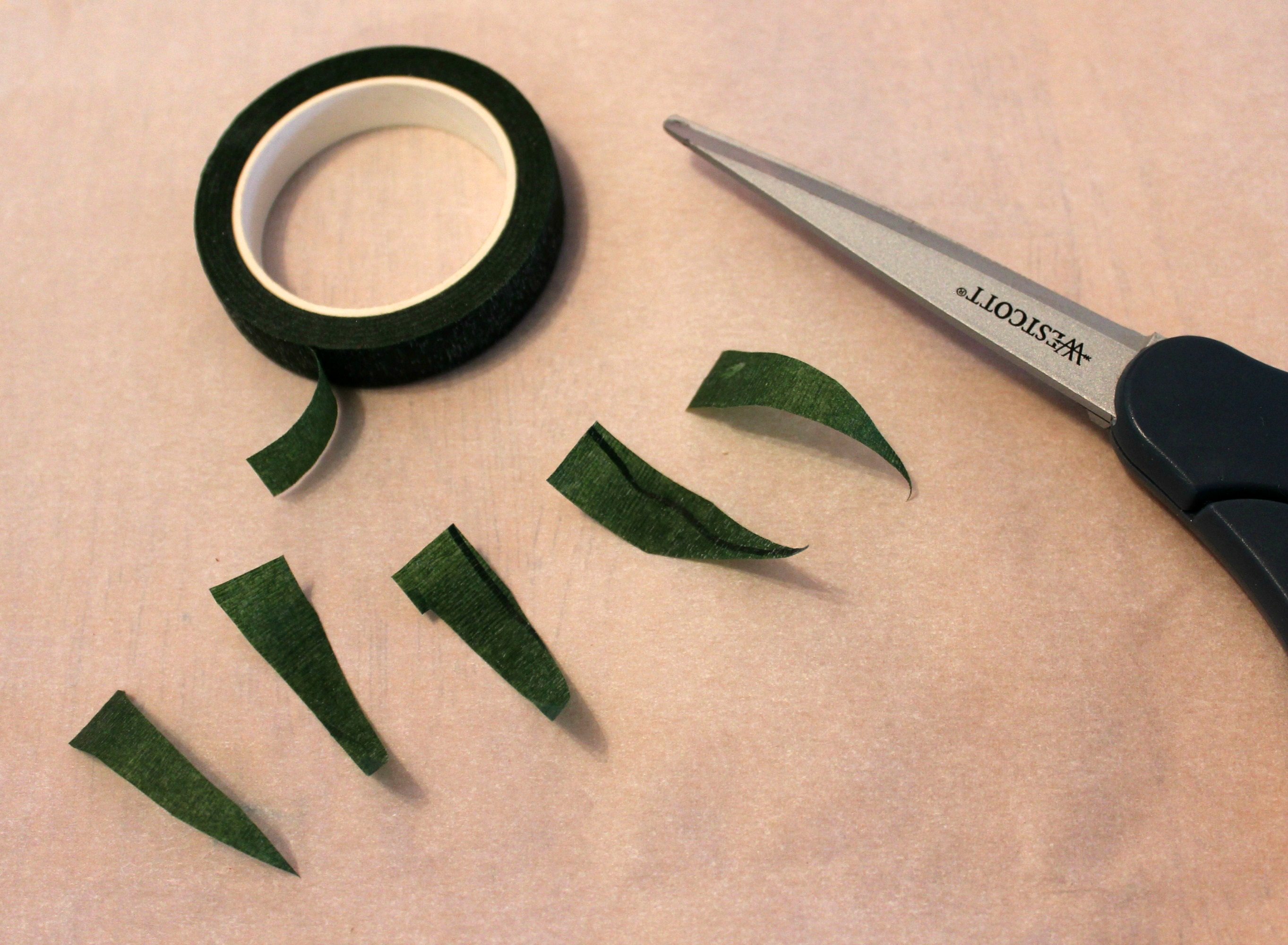 5. Let the tissue and glue set for a few minutes. While this is happening, cut 5 2-inch pieces of floral tape and trim them to create long points. These will be the sepals.
