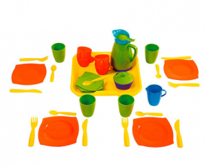 This sweet supper set includes service for four and is perfect for pretend dinner parties. Color blocked pieces are cleverly coordinating and great for creative play.