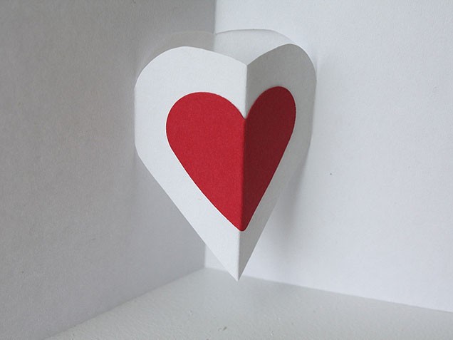 How to make it: Cut out a heart-shaped pattern from the red construction paper. Then fold the white paper into quarters. Open it up and fold in half lengthwise. Fold the heart-shaped cutout over the edge of one of the creased quarters. Cut around the heart’s edge until you come to the roundest part, then stop. Next, cut along the heart’s diagonal side, starting from the bottom. Stop once the shape’s side starts to curve. Set aside the pattern and fold the heart to the left side. Refold the paper the short way and reverse the pop-up heart’s folds. Glue the red heart down onto the white pop-up. Let dry, and then carefully close.