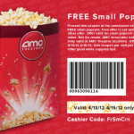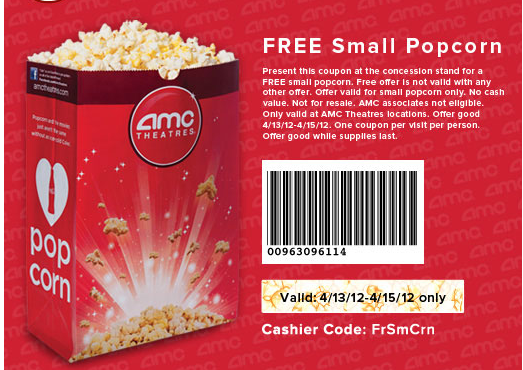 FREE Small Popcorn at AMC Movie Theaters-Just print out this coupon to redeem your FREE Small Popcorn! Offer valid April 13th-April 15th! Enjoy! 🙂
