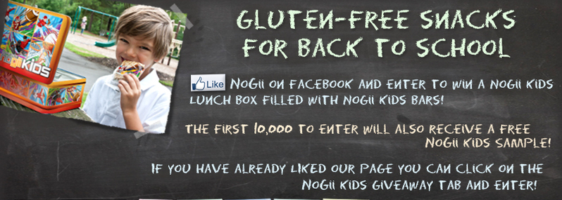 Head on over to NoGii’s Facebook page and enter to win a NoGii Kids Lunch Box filled with NoGii No Gluten Kids Bars! The first 10,000 to enter will receive a FREE sample of the NoGii Kids Marshmallow Crisp bar! All you need to do is LIKE them on facebook here, then fill in your information. Contest runs Aug. 7th-17th. Us residents only. Limited to one per household!! Good Luck all!