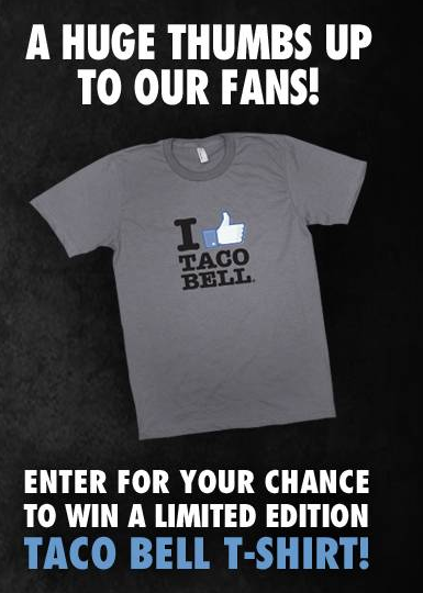 Head on over to Taco Bell’s Facebook Page and enter to win 1 of 900 Limited Edition Taco Bell T-Shirts! You will just need to LIKE their page and then fill in your information. Sweepstake ends 8/15. Good Luck all!!