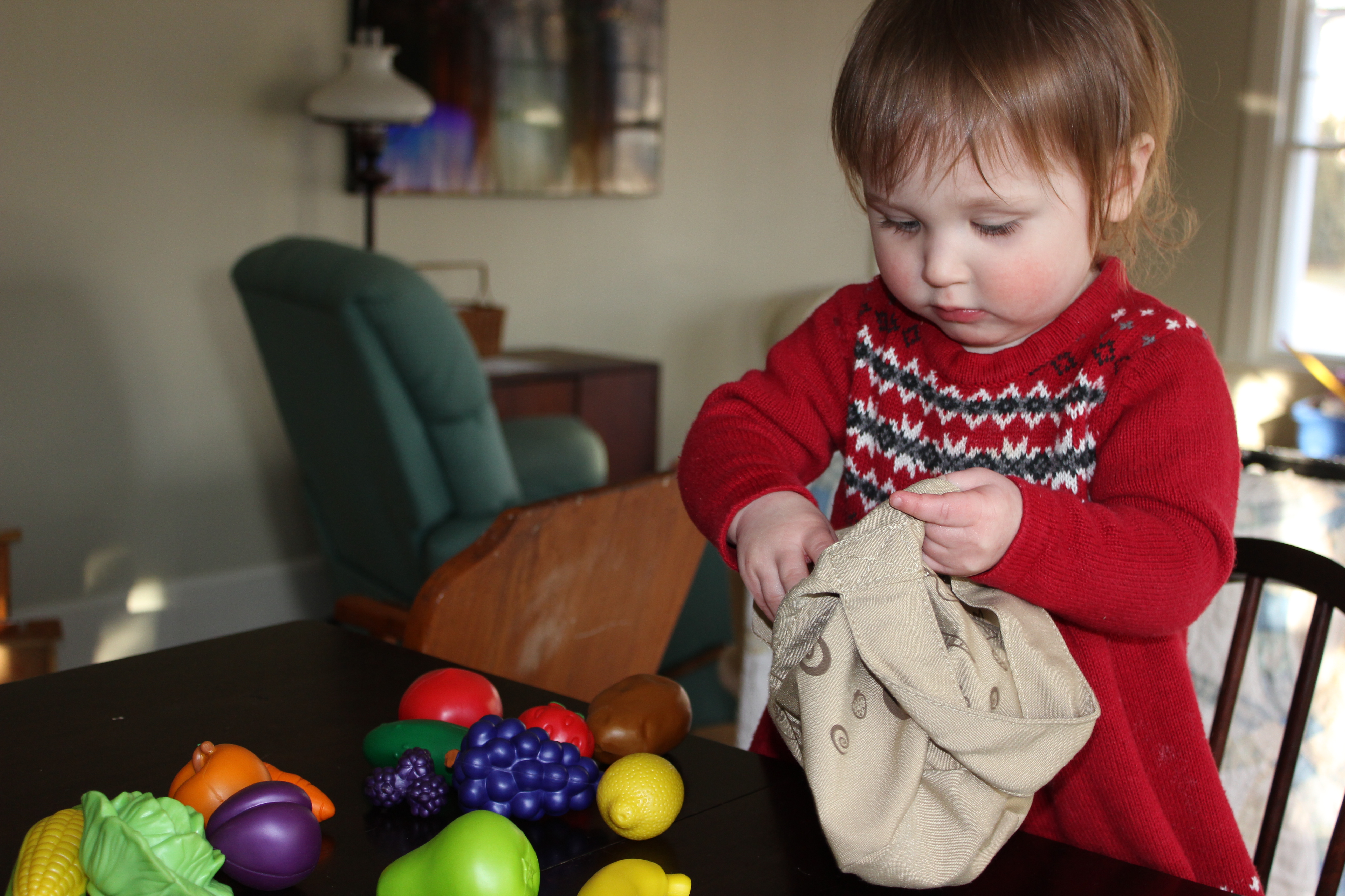 My daughters eyes lit up when I opened the Fruit & Veggie Tote. The colors were so bright and she started yelling bapple bapple (her IMG_2931 way of saying apple). The stitching on the tote looked great and has taken her abuse well. I absolutely LOVE the feel and texture of the fruits and vegetables. I have seen quite a few sets sold at the store and haven picked them up because you can just tell that the pieces are very cheaply made. Not with the fruit and veggie tote!! The pieces are very well made and they just feel great when holding them in your hand. We have had tons of fun with it already and I cannot wait until summertime when we can play garden!