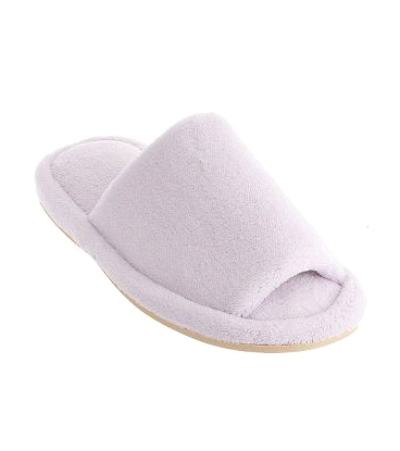 So let me tell you a little about these slippers. They are comfortable. They have visco-elastic memory foam in the bottom of the sole that contours to your foot. It is made of soft terry fabric and I have to say that it is VERY soft. It is an attractive style that comes in open or closed toed. I chose the open toe just because it is summer and I thought my feet might get hot. So you know this winter I may have to order the close toed ones. They come in small, medium, large and extra large. Colors available are lavender, pale blue and mocha in the open toed. The colors available in the close toed are pale blue, pink and sand. Oh, don’t let me forget to tell you the best part! The soles are good on multiple indoor surfaces and are highly durable. I’m gonna be honest with you. I take the trash out in them all the time. I have to walk just a ways down the road to my trash behind the garage and my shoes are holding up just fine. I can’t make any promises because it does say indoor but I’m just letting you know mine look fine.