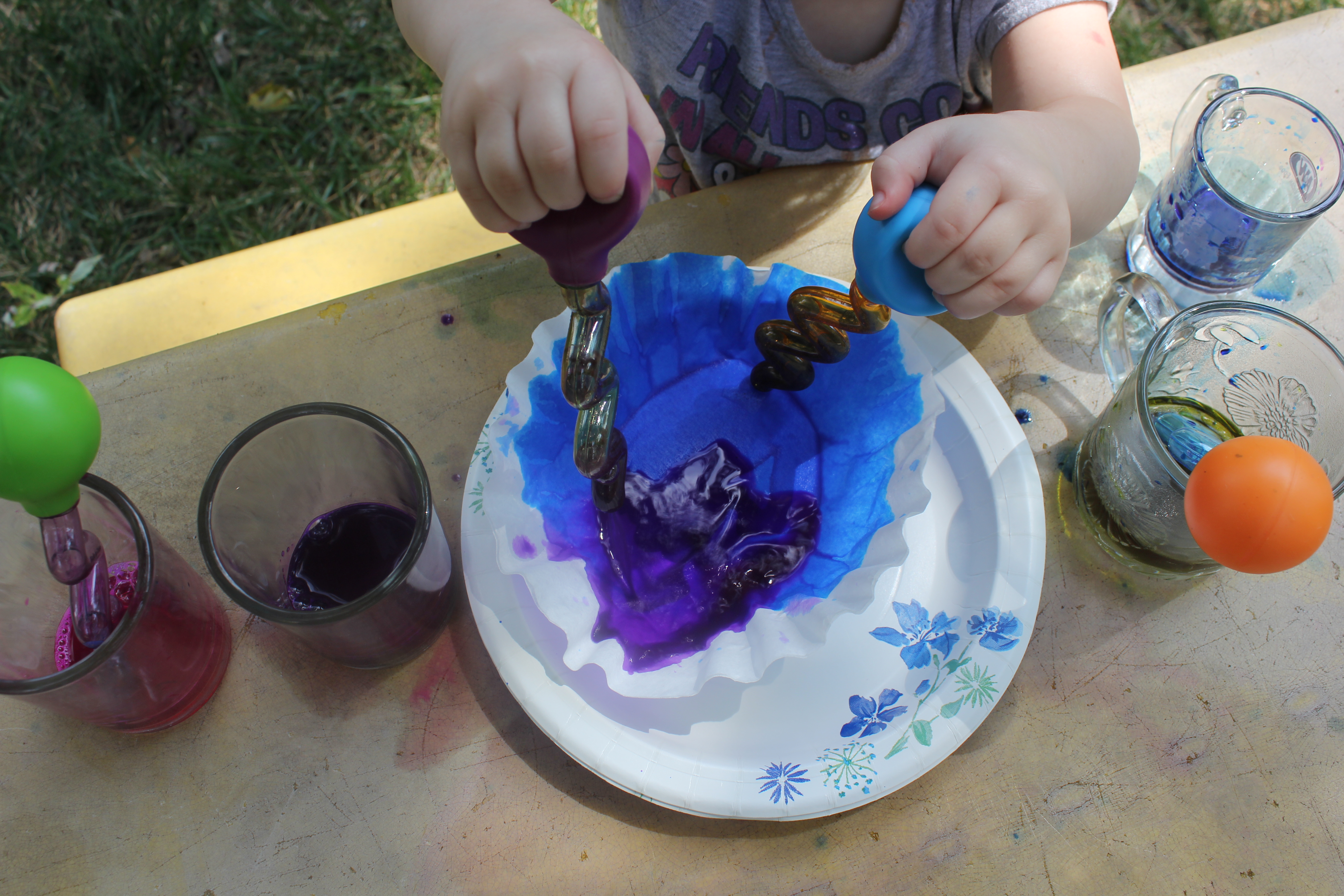 3. I took the coffee filters and put them on some paper plates which we did outside on her picnic table to keep the mess off my floor!  Once we had the coffee filters on the plates and I showed her how to squeeze the droppers, pick them up and re-squeeze them onto the filters she was squealing in delight! She loved the bright colors and the fact that she was actually moving the colors around. It also didn’t take her long to figure out if she just kept squeezing the Twisty IMG_4109 Droppers while they were in the watercolor that they made lots of bubbles!!