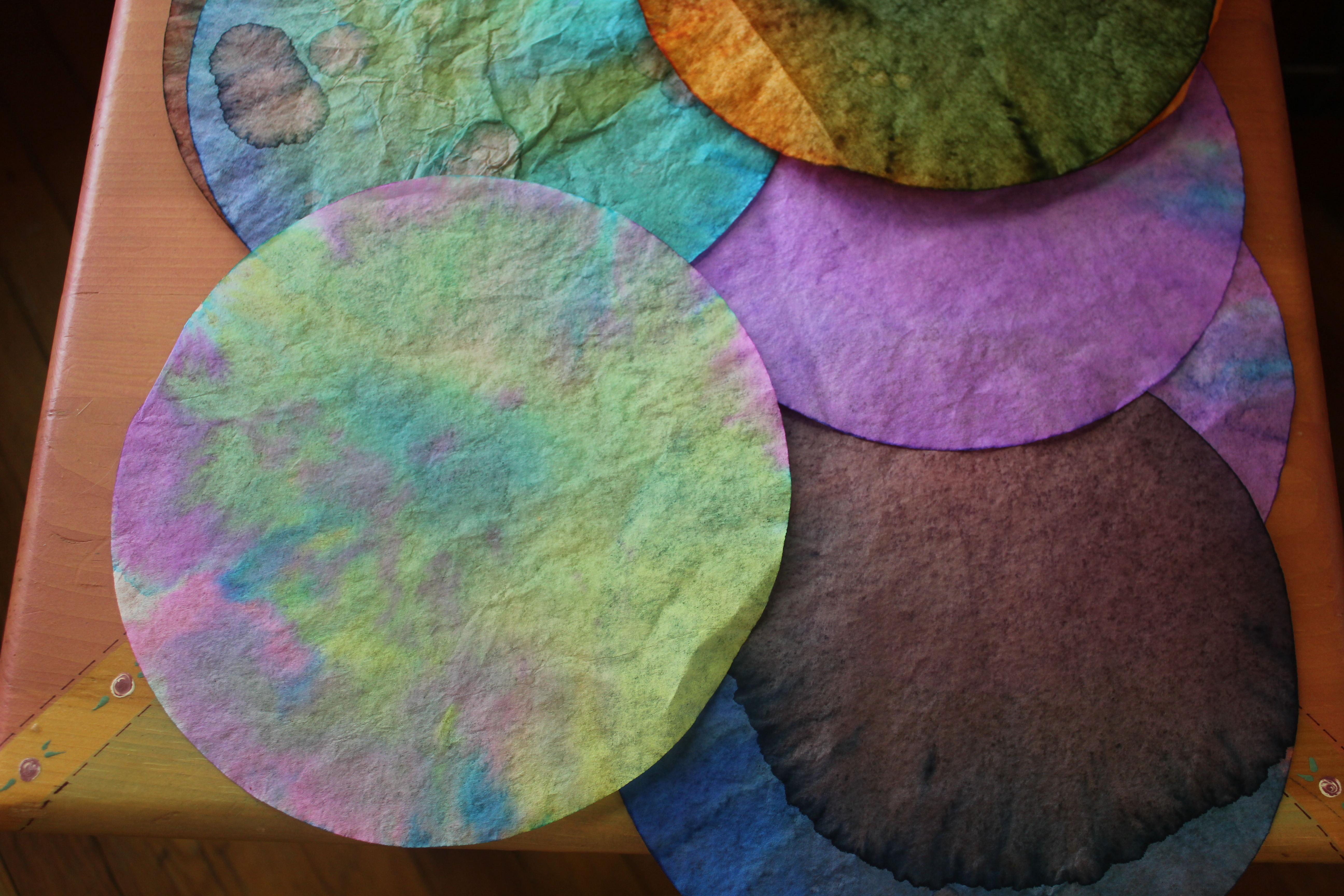 I found some twisty droppers at Learning Resources and figured they would work really well with watercolor and some coffee filters. Most of these items we just had around the house so they didn’t cost an arm and a leg to make and ended up being hours of fun!