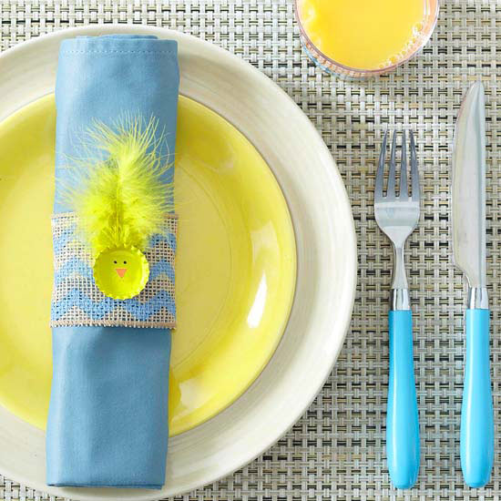 Kids will love helping out with setting the Easter table — if it means they get to make these adorable napkin rings! To make, paint a bottle cap yellow and let dry. Use a black paint marker to add eyes and a small orange triangle of paper for the beak. Add a yellow feather to the back of the bottle cap, and glue the chick to a piece of wide ribbon about 4-1/2 inches long. Glue a second smaller ribbon to back to tie the napkin ring together.