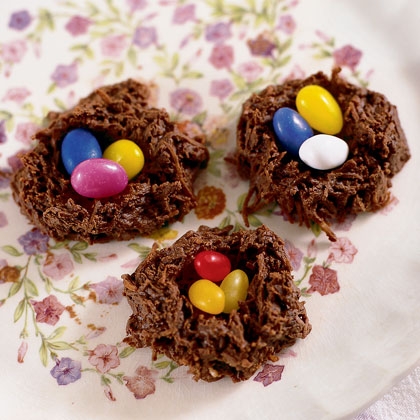 - While the nests are still warm, use your thumbs to poke an impression into the middle of each. Cool them, then fill with jelly bean eggs. Makes about 1 dozen.
