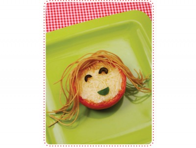 7. Transfer the tomato halves to a plate to cool for a few minutes. Tear the top of each basil leaf off and place it under the eyes for a smile. Now add the spaghetti hair to the tomato top to create a super style.