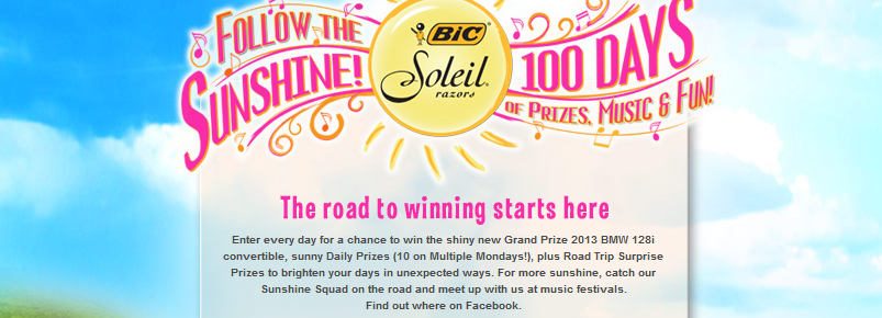 Head on over here and get in on the “Follow the Sunshine”  Sweepstakes from Bic Soleile. This sweepstakes os going on until August 8th and they are giving away prizes every day!! To increase your chances of winning enter every day! 🙂 Some of the prizes include Target gift card, schwinn Beach Cruiser Bike, Kate Spade Bangle Bracelet or Pearl Drum Kit. Tons of prizes! Good Luck!