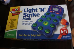 We had a great time playing the Light ‘N’ Strike Math® game. My daughter is allowed to use a calculator in school and I often worry about how well she really knows her math facts. She did a great job and I could tell after she played for a while it was becoming easier for her. There were facts that I couldn’t remember at all (it’s been a while since I’ve been in school) and it did become easier after I had seen them on the game a few times. Charlee Ann (my youngest at 1 1/2 years) really liked the flashing lights and was quick to grab the game off the table (this is not recommended but it did happen) and she decided that the way you played the game was to throw it across the room. The game held up without a scratch and we learned to put the game up and out of her reach. One thing that was a little nerve racking was when you had to wait for a number to light up to get the answer. I wanted instant gratification when I knew the right answer!!