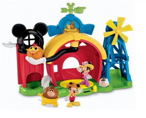 The Mickey Mouse Barnyard Dance includes Mickey, Minnie, three animal rounds and a wheelbarrow. Mickey and Minnie have tons of work to do on the farm that will keep little hands busy and having fun. There is a lift on the left hand side that your little ones can put the animal rounds in and lift them up and into Mickeys hand which swings them on around and into the windmill activating it. My daughter gets a big kick out of being the one to make the windmill spin around and around! The animal rounds are so cute and their round shape keeps them rolling around which keeps my little one on her toes.