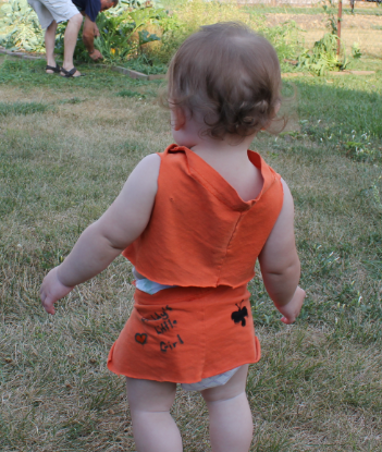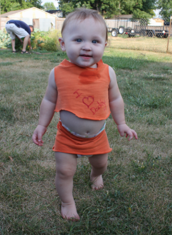 one side than the other which just makes it precious!! The top is a little half shirt with a wide neck so she can where the shoulder  or hanging off!! Like I said, when Tom was cutting the arms out of his old t-shirt (so he could get rid of his farmers tan), Alicia snapped right up on that extra fabric. Now I do have to say that the front is equally as cute when she is running across the yard. Now the skirt is a little short and  if she wore the shirt when she was 16 she would be in big trouble! But I think it is absolutely adorable on my precious Charlee Ann!! Far be it from me to squash Alicia’s creativity! I think she did a fabulous job! Two thumbs up from mamma to you Alicia! You make me proud! 🙂