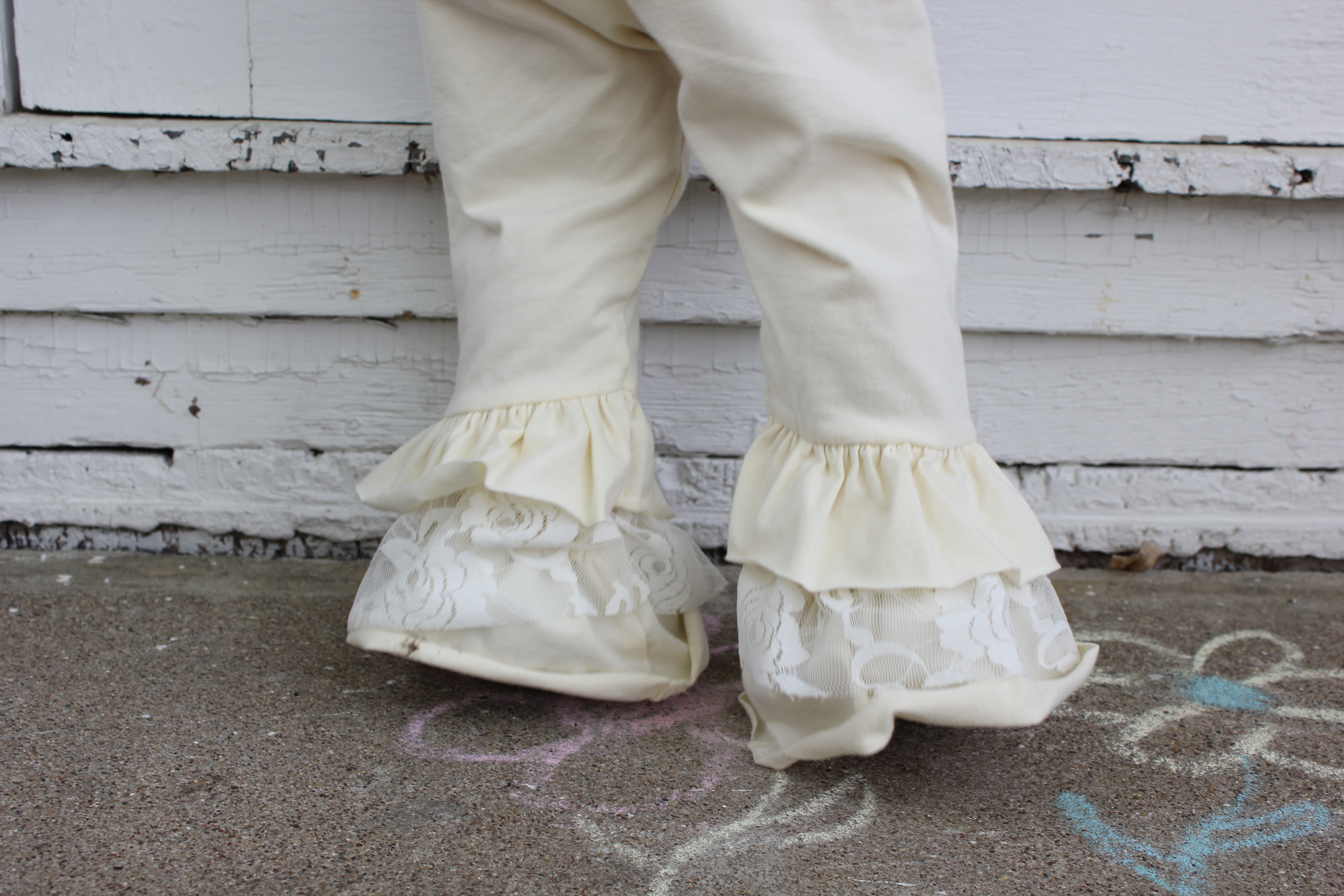 ruffles on the bottom, 2 of them are the same material as the pants and then the middle ruffle is a beautiful white lace. They are absolutely beautiful on and comfortable for her too. I like her to be beautiful but comfort is a must!!